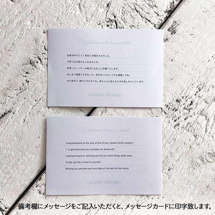 はい、可能です。”HELLO BABY”オリジナルのポストカードサイズ(148×100mm)オリジナルのメッセージカードの裏面にメッセージを印字させていただきます。必ずメッセージカード付きのラッピングをご選択いただき、備考欄にてメッセージをご記入ください。